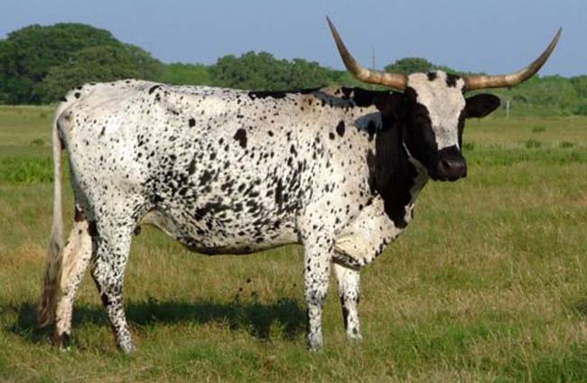 Here is a beautiful front pasture Longhorn. 00 Lolita is a very feminine black and white speckled cow with good horn. Her great background includes Impressive, Hondo, Don Quintana, Texas Ranger JP, Ranger`s Measles and Measles 2849. By clicking on her progeny, you can see that Lolita is a consistent producer and has given us four gorgeous heifers out of her last five calves. |